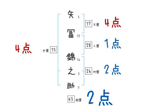 総運![]() | 矢冨錦之助さんの総運は43画の2つ星!頑固な性格で独立心が強いかも。やや非現実的で浪費に注意しましょう。 あなたの人生を表す1番重要な運勢です。生涯を通じて影響する総合運となり、主に50歳以降の晩年期に影響を及ぼします。 |