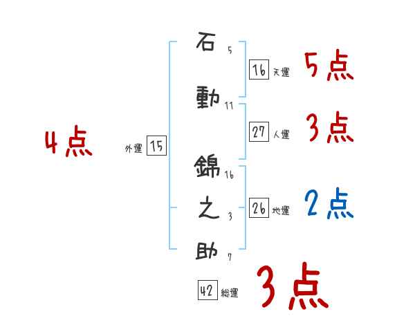 天運![]() | 石動錦之助さんの天運は16画の5つ星!人望が厚く大きく発展する。逆転成功が見える。 家系が持つ宿命的な運勢を表します。祖先から受け継いだ苗字ですので自分の力が及びません。家柄を象徴します。 |