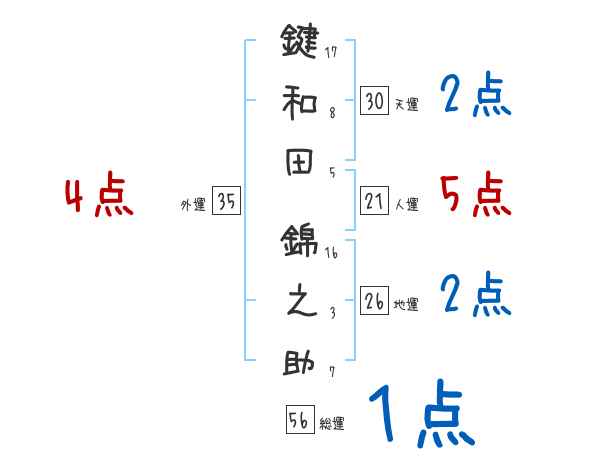 外運![]() | 鍵和田錦之助さんの外運は35画の4つ星!温厚な性格で感受性が高い。穏和な性格で人望が厚い。 生活面を象徴する運勢です。外部から受ける影響力を表し、結婚運、家庭運や職場、環境への順応性を表します。 |