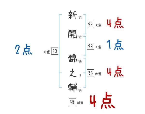 総運![]() | 新開錦之輔さんの総運は58画の4つ星!安定した生活。大器晩成タイプ。 あなたの人生を表す1番重要な運勢です。生涯を通じて影響する総合運となり、主に50歳以降の晩年期に影響を及ぼします。 |