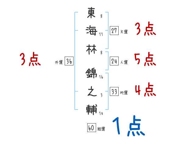 人運![]() | 東海林錦之輔さんの人運は24画の5つ星!家庭運が良く順調な人生。金運にも恵まれる。 性格や才能などを表す2番目に重要な運勢です。人間関係や協調性、社会的な成功に影響します。主に20歳から50歳ぐらいまでの中年期の運勢を表します。 |