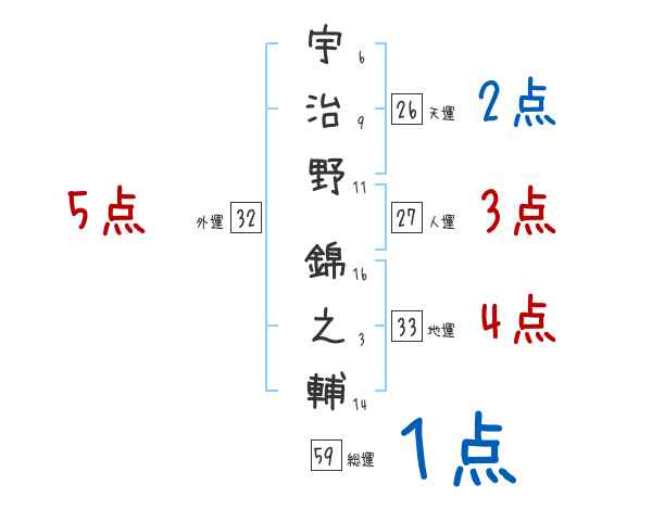 外運![]() | 宇治野錦之輔さんの外運は32画の5つ星!柔軟性があり成功する。チャンスが多く金運が良い。 生活面を象徴する運勢です。外部から受ける影響力を表し、結婚運、家庭運や職場、環境への順応性を表します。 |