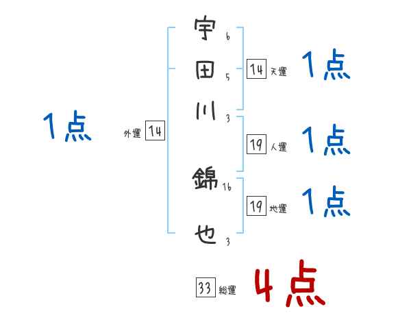 天運![]() | 宇田川錦也さんの天運は14画の1つ星!人に対して優しいがストレスを溜め込みがち。人間関係のトラブルを避けるよう気をつけましょう。 家系が持つ宿命的な運勢を表します。祖先から受け継いだ苗字ですので自分の力が及びません。家柄を象徴します。 |