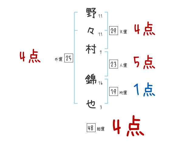 天運![]() | 野々村錦也さんの天運は29画の4つ星!完全主義で才能がある。厳格な心の持ち主。 家系が持つ宿命的な運勢を表します。祖先から受け継いだ苗字ですので自分の力が及びません。家柄を象徴します。 |