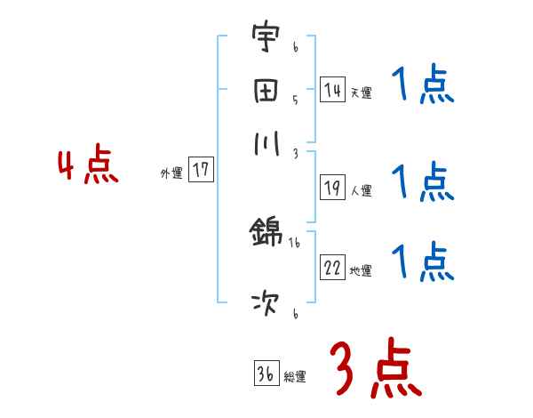 外運![]() | 宇田川錦次さんの外運は17画の4つ星!積極的な行動力。地位を気づき財産を手に入れる。純粋な心と直感力。 生活面を象徴する運勢です。外部から受ける影響力を表し、結婚運、家庭運や職場、環境への順応性を表します。 |