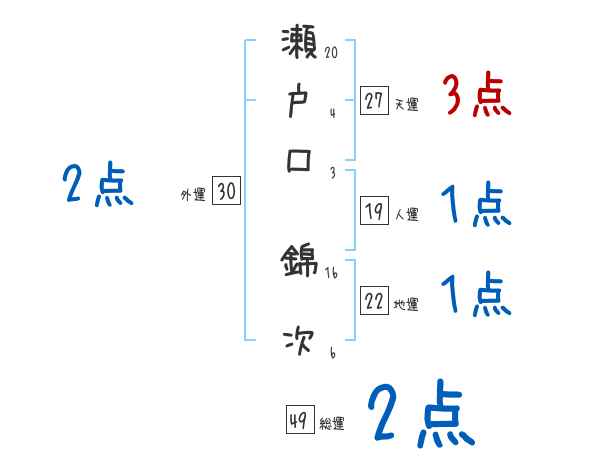 天運![]() | 瀬戸口錦次さんの天運は27画の3つ星!頭脳明晰だが強情で摩擦が多い傾向。孤立に注意。 家系が持つ宿命的な運勢を表します。祖先から受け継いだ苗字ですので自分の力が及びません。家柄を象徴します。 |