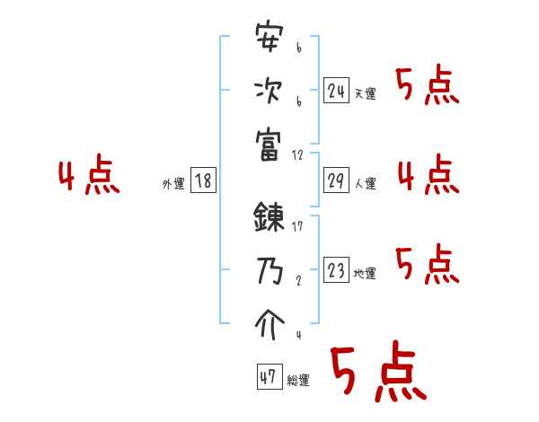 総運![]() | 安次富錬乃介さんの総運は47画の5つ星!実力が開花し発展する円満な人生。財に恵まれる。 あなたの人生を表す1番重要な運勢です。生涯を通じて影響する総合運となり、主に50歳以降の晩年期に影響を及ぼします。 |