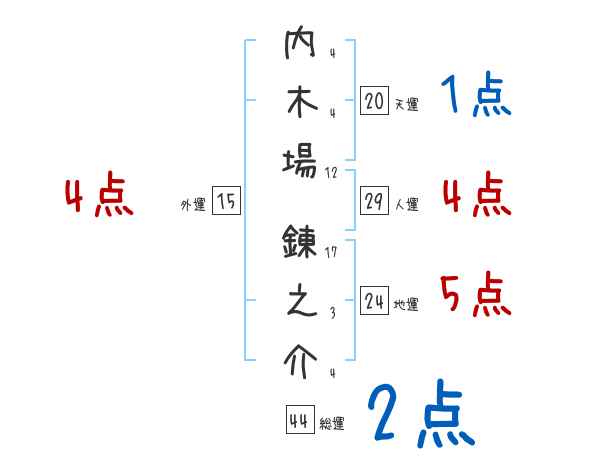 総運![]() | 内木場錬之介さんの総運は44画の2つ星!誠実で慎重な性格。物事を考えすぎないように注意しましょう。 あなたの人生を表す1番重要な運勢です。生涯を通じて影響する総合運となり、主に50歳以降の晩年期に影響を及ぼします。 |
