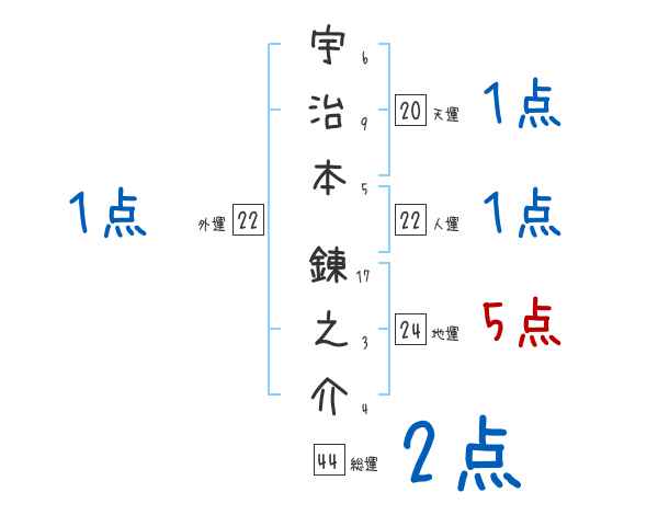 宇治本錬之介さんの画数の鑑定結果