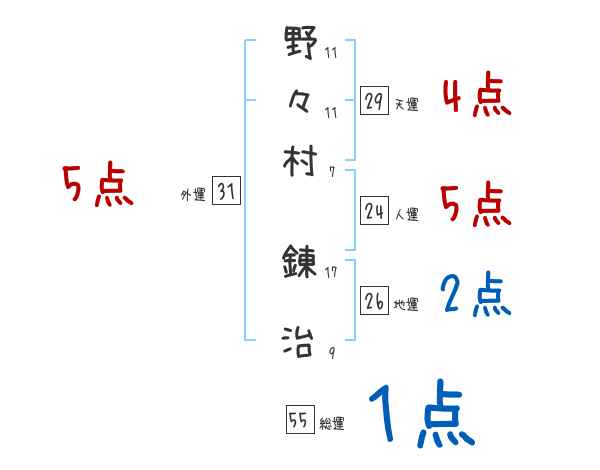 天運![]() | 野々村錬治さんの天運は29画の4つ星!完全主義で才能がある。厳格な心の持ち主。 家系が持つ宿命的な運勢を表します。祖先から受け継いだ苗字ですので自分の力が及びません。家柄を象徴します。 |