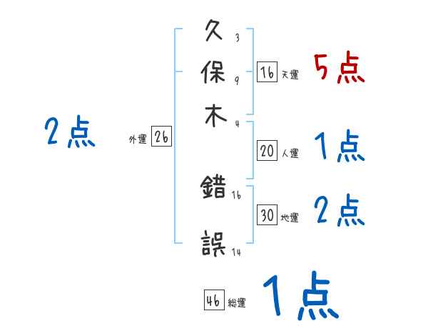 総運![]() | 久保木錯誤さんの総運は46画の1つ星!迷走することが多く苦労するかも。目先のことにとらわれないように。 あなたの人生を表す1番重要な運勢です。生涯を通じて影響する総合運となり、主に50歳以降の晩年期に影響を及ぼします。 |