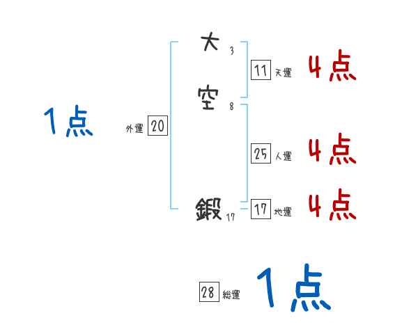 天運![]() | 大空鍛さんの天運は11画の4つ星!着実に富や地位を得る幸運な人生。 家系が持つ宿命的な運勢を表します。祖先から受け継いだ苗字ですので自分の力が及びません。家柄を象徴します。 |