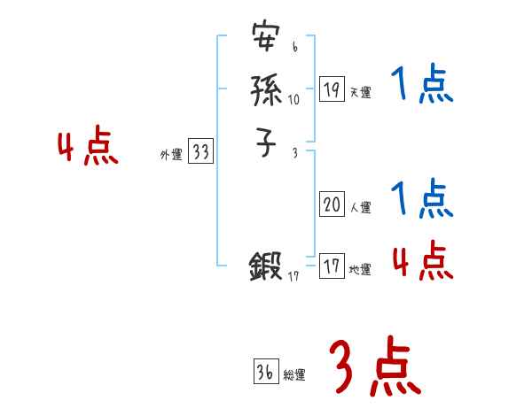 外運![]() | 安孫子鍛さんの外運は33画の4つ星!権力志向でプライドが高い。勇気があり運を切り開き成功する。 生活面を象徴する運勢です。外部から受ける影響力を表し、結婚運、家庭運や職場、環境への順応性を表します。 |