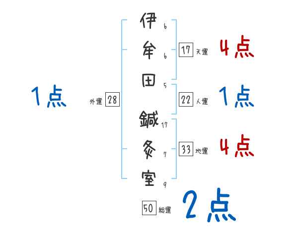 人運![]() | 伊牟田鍼灸室さんの人運は22画の1つ星!努力することが苦手ないっぽう手先が器用。芸術性にも優れる。 性格や才能などを表す2番目に重要な運勢です。人間関係や協調性、社会的な成功に影響します。主に20歳から50歳ぐらいまでの中年期の運勢を表します。 |