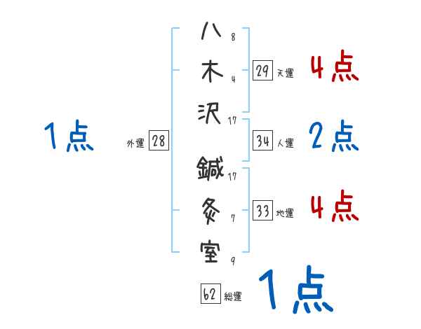 天運![]() | 八木沢鍼灸室さんの天運は29画の4つ星!完全主義で才能がある。厳格な心の持ち主。 家系が持つ宿命的な運勢を表します。祖先から受け継いだ苗字ですので自分の力が及びません。家柄を象徴します。 |