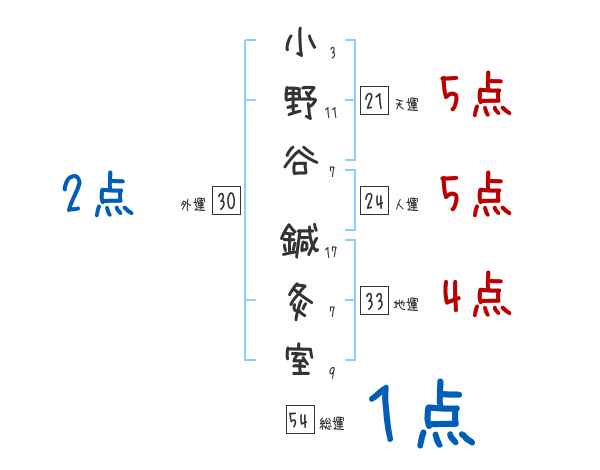天運![]() | 小野谷鍼灸室さんの天運は21画の5つ星!統率力がある。独立し成功する。名誉を手に入れる。 家系が持つ宿命的な運勢を表します。祖先から受け継いだ苗字ですので自分の力が及びません。家柄を象徴します。 |