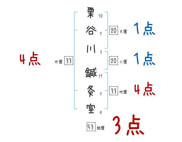 外運![]() | 栗谷川鍼灸室さんの外運は33画の4つ星!権力志向でプライドが高い。勇気があり運を切り開き成功する。 生活面を象徴する運勢です。外部から受ける影響力を表し、結婚運、家庭運や職場、環境への順応性を表します。 |