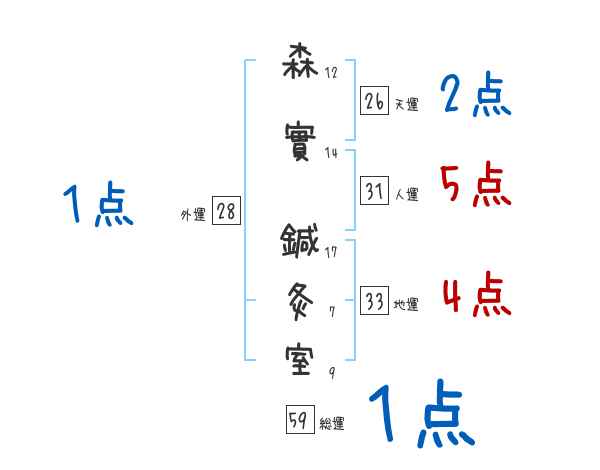 総運![]() | 森實鍼灸室さんの総運は59画の1つ星!意志の弱さであきらめることが多いかも。粘り強さが必要。 あなたの人生を表す1番重要な運勢です。生涯を通じて影響する総合運となり、主に50歳以降の晩年期に影響を及ぼします。 |