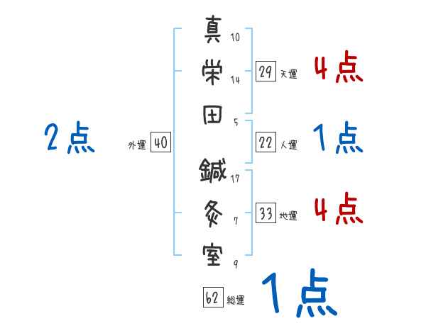 天運![]() | 真栄田鍼灸室さんの天運は29画の4つ星!完全主義で才能がある。厳格な心の持ち主。 家系が持つ宿命的な運勢を表します。祖先から受け継いだ苗字ですので自分の力が及びません。家柄を象徴します。 |