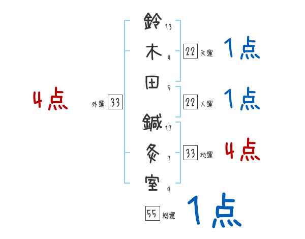 天運![]() | 鈴木田鍼灸室さんの天運は22画の1つ星!努力することが苦手ないっぽう手先が器用。芸術性にも優れる。 家系が持つ宿命的な運勢を表します。祖先から受け継いだ苗字ですので自分の力が及びません。家柄を象徴します。 |