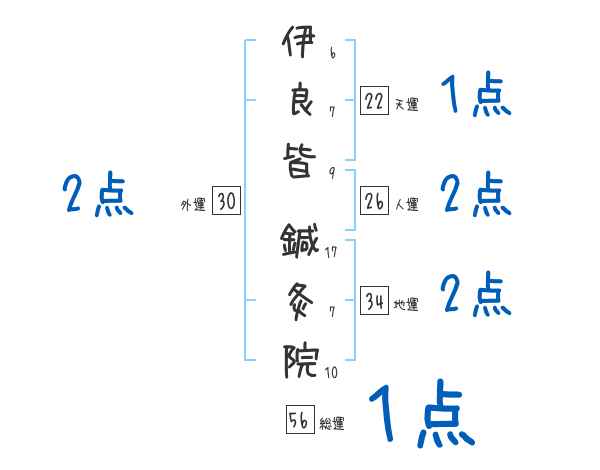 天運![]() | 伊良皆鍼灸院さんの天運は22画の1つ星!努力することが苦手ないっぽう手先が器用。芸術性にも優れる。 家系が持つ宿命的な運勢を表します。祖先から受け継いだ苗字ですので自分の力が及びません。家柄を象徴します。 |