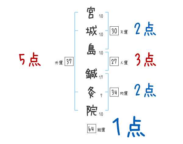 天運![]() | 宮城島鍼灸院さんの天運は30画の2つ星!浮き沈みの激しさに注意しましょう。 家系が持つ宿命的な運勢を表します。祖先から受け継いだ苗字ですので自分の力が及びません。家柄を象徴します。 |