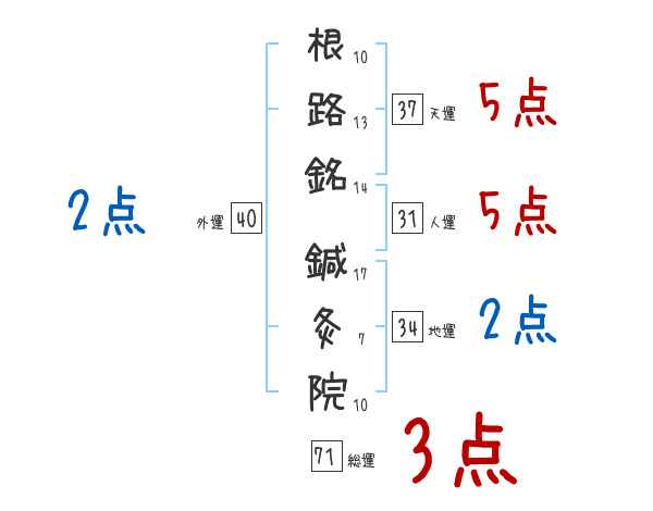 総運![]() | 根路銘鍼灸院さんの総運は71画の3つ星!力が弱く小心者だが、いずれ安泰を手に入れる。 あなたの人生を表す1番重要な運勢です。生涯を通じて影響する総合運となり、主に50歳以降の晩年期に影響を及ぼします。 |
