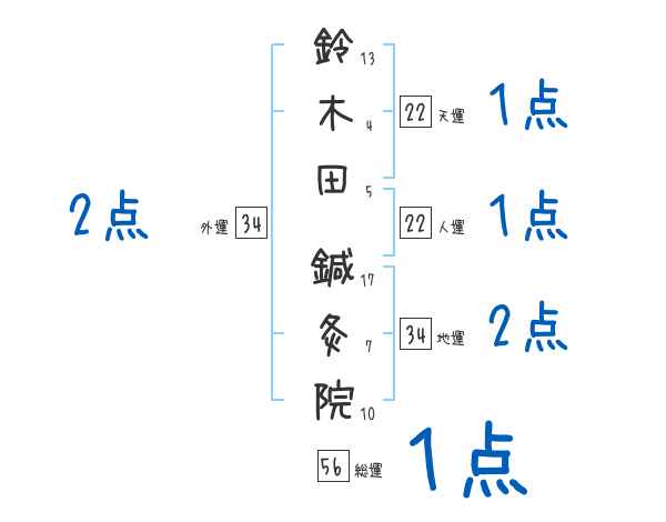 天運![]() | 鈴木田鍼灸院さんの天運は22画の1つ星!努力することが苦手ないっぽう手先が器用。芸術性にも優れる。 家系が持つ宿命的な運勢を表します。祖先から受け継いだ苗字ですので自分の力が及びません。家柄を象徴します。 |