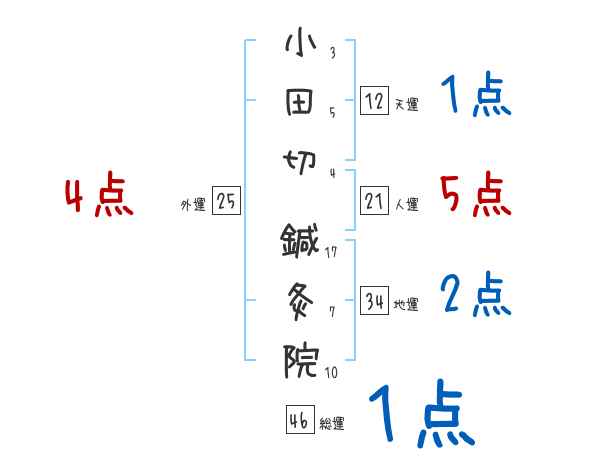総運![]() | 小田切鍼灸院さんの総運は46画の1つ星!迷走することが多く苦労するかも。目先のことにとらわれないように。 あなたの人生を表す1番重要な運勢です。生涯を通じて影響する総合運となり、主に50歳以降の晩年期に影響を及ぼします。 |