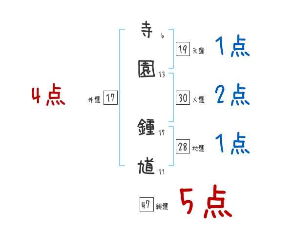 天運![]() | 寺園鍾馗さんの天運は19画の1つ星!優れた才能を持ちますが、協調性が足りないことも。周りの人と協力する事を意識しましょう。 家系が持つ宿命的な運勢を表します。祖先から受け継いだ苗字ですので自分の力が及びません。家柄を象徴します。 |
