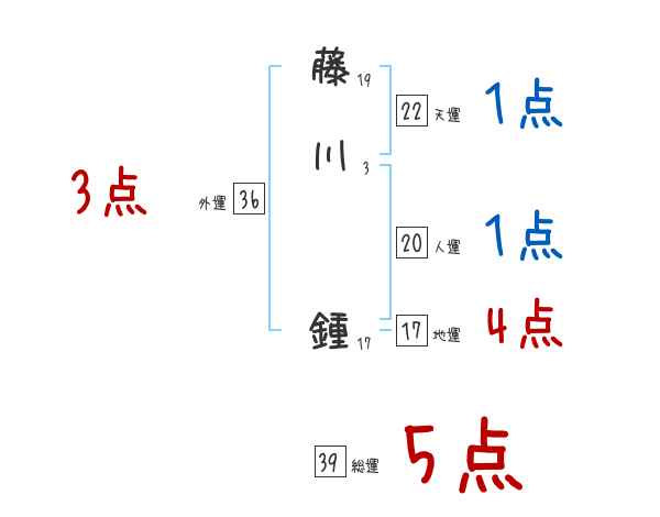 外運![]() | 藤川鍾さんの外運は36画の3つ星!先見性が豊かです。多少神経質で苦労することも。 生活面を象徴する運勢です。外部から受ける影響力を表し、結婚運、家庭運や職場、環境への順応性を表します。 |