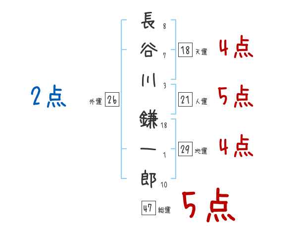 天運![]() | 長谷川鎌一郎さんの天運は18画の4つ星!情熱的で剛気。忍耐力があり信頼される。 家系が持つ宿命的な運勢を表します。祖先から受け継いだ苗字ですので自分の力が及びません。家柄を象徴します。 |