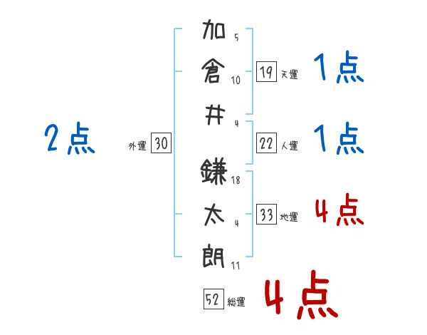 地運![]() | 加倉井鎌太朗さんの地運は33画の4つ星!権力志向でプライドが高い。勇気があり運を切り開き成功する。 個性を表す基礎的な運勢です。性格形成や対人関係、行動力など家庭環境に影響されます。主に誕生してから20歳くらいまでの若年期の運勢を表します。 |