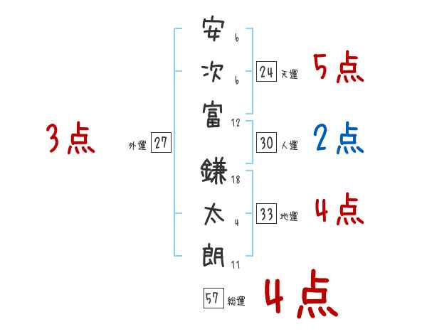 天運![]() | 安次富鎌太朗さんの天運は24画の5つ星!家庭運が良く順調な人生。金運にも恵まれる。 家系が持つ宿命的な運勢を表します。祖先から受け継いだ苗字ですので自分の力が及びません。家柄を象徴します。 |