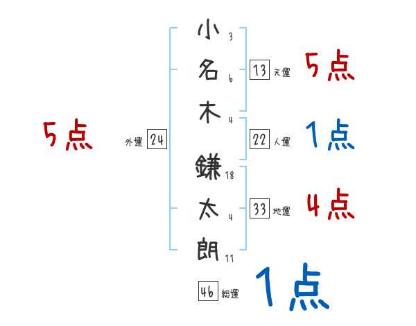 外運![]() | 小名木鎌太朗さんの外運は24画の5つ星!家庭運が良く順調な人生。金運にも恵まれる。 生活面を象徴する運勢です。外部から受ける影響力を表し、結婚運、家庭運や職場、環境への順応性を表します。 |