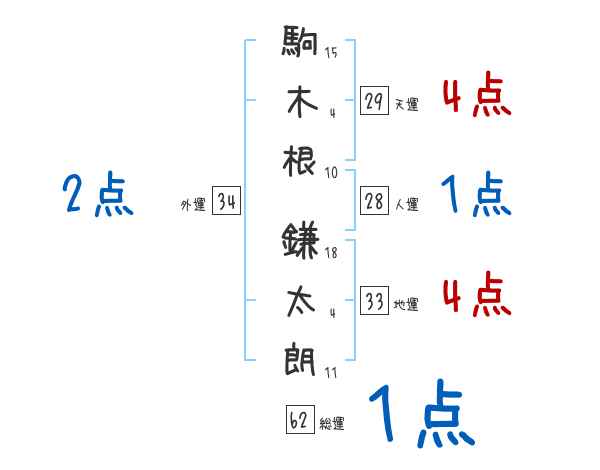 天運![]() | 駒木根鎌太朗さんの天運は29画の4つ星!完全主義で才能がある。厳格な心の持ち主。 家系が持つ宿命的な運勢を表します。祖先から受け継いだ苗字ですので自分の力が及びません。家柄を象徴します。 |