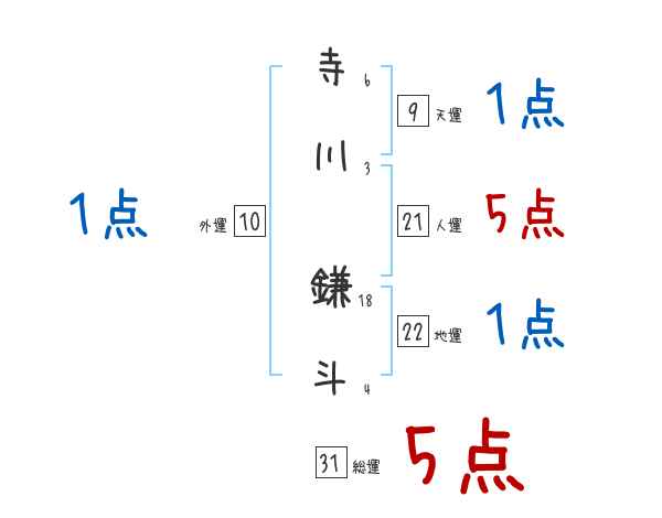 天運![]() | 寺川鎌斗さんの天運は9画の1つ星!消極的で才能を発揮することが苦手なことも。周りの意見に耳を傾けましょう。 家系が持つ宿命的な運勢を表します。祖先から受け継いだ苗字ですので自分の力が及びません。家柄を象徴します。 |
