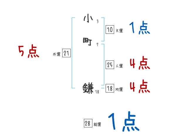 総運![]() | 小町鎌さんの総運は28画の1つ星!家庭環境に注意。スポーツで活躍できる能力があるかも。 あなたの人生を表す1番重要な運勢です。生涯を通じて影響する総合運となり、主に50歳以降の晩年期に影響を及ぼします。 |