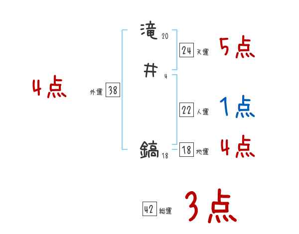 天運![]() | 滝井鎬さんの天運は24画の5つ星!家庭運が良く順調な人生。金運にも恵まれる。 家系が持つ宿命的な運勢を表します。祖先から受け継いだ苗字ですので自分の力が及びません。家柄を象徴します。 |