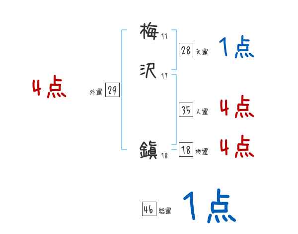 外運![]() | 梅沢鎭さんの外運は29画の4つ星!完全主義で才能がある。厳格な心の持ち主。 生活面を象徴する運勢です。外部から受ける影響力を表し、結婚運、家庭運や職場、環境への順応性を表します。 |
