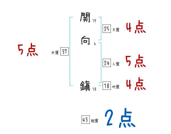 外運![]() | 関向鎭さんの外運は37画の5つ星!努力家で順応性に優れる。現実的な考え方ができ忠実に物事をこなす。 生活面を象徴する運勢です。外部から受ける影響力を表し、結婚運、家庭運や職場、環境への順応性を表します。 |