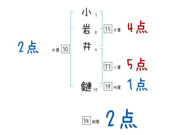 総運![]() | 小岩井鏈さんの総運は34画の2つ星!独創性に優れるが、自尊心が強く災難に注意しましょう。 あなたの人生を表す1番重要な運勢です。生涯を通じて影響する総合運となり、主に50歳以降の晩年期に影響を及ぼします。 |