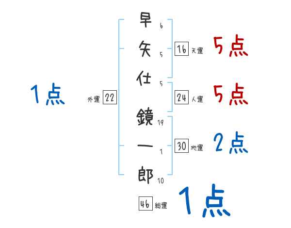 総運![]() | 早矢仕鏡一郎さんの総運は46画の1つ星!迷走することが多く苦労するかも。目先のことにとらわれないように。 あなたの人生を表す1番重要な運勢です。生涯を通じて影響する総合運となり、主に50歳以降の晩年期に影響を及ぼします。 |