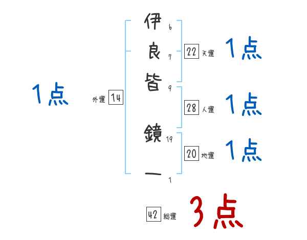 天運![]() | 伊良皆鏡一さんの天運は22画の1つ星!努力することが苦手ないっぽう手先が器用。芸術性にも優れる。 家系が持つ宿命的な運勢を表します。祖先から受け継いだ苗字ですので自分の力が及びません。家柄を象徴します。 |