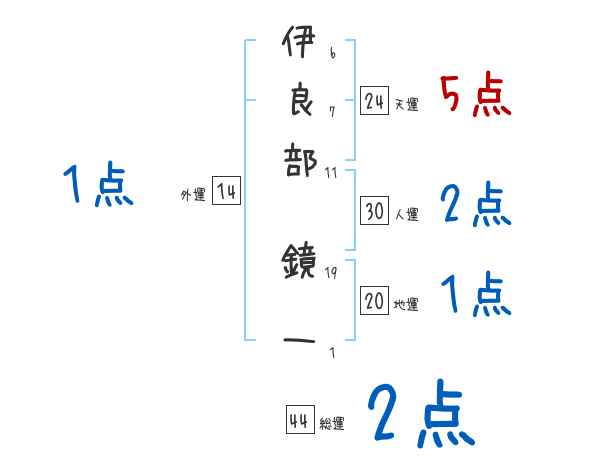 天運![]() | 伊良部鏡一さんの天運は24画の5つ星!家庭運が良く順調な人生。金運にも恵まれる。 家系が持つ宿命的な運勢を表します。祖先から受け継いだ苗字ですので自分の力が及びません。家柄を象徴します。 |