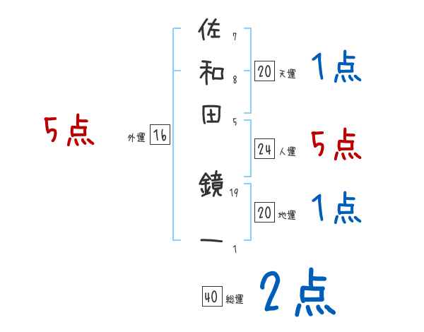 人運![]() | 佐和田鏡一さんの人運は24画の5つ星!家庭運が良く順調な人生。金運にも恵まれる。 性格や才能などを表す2番目に重要な運勢です。人間関係や協調性、社会的な成功に影響します。主に20歳から50歳ぐらいまでの中年期の運勢を表します。 |