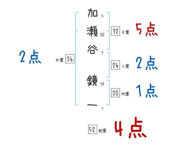 天運![]() | 加瀬谷鏡一さんの天運は32画の5つ星!柔軟性があり成功する。チャンスが多く金運が良い。 家系が持つ宿命的な運勢を表します。祖先から受け継いだ苗字ですので自分の力が及びません。家柄を象徴します。 |