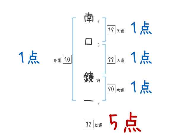 総運![]() | 南口鏡一さんの総運は32画の5つ星!柔軟性があり成功する。チャンスが多く金運が良い。 あなたの人生を表す1番重要な運勢です。生涯を通じて影響する総合運となり、主に50歳以降の晩年期に影響を及ぼします。 |