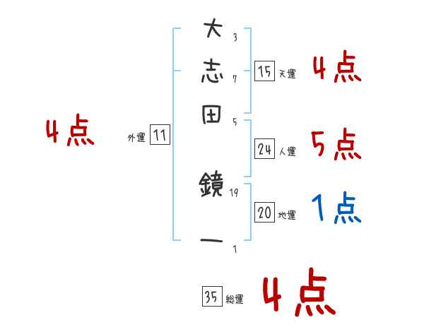 総運![]() | 大志田鏡一さんの総運は35画の4つ星!温厚な性格で感受性が高い。穏和な性格で人望が厚い。 あなたの人生を表す1番重要な運勢です。生涯を通じて影響する総合運となり、主に50歳以降の晩年期に影響を及ぼします。 |