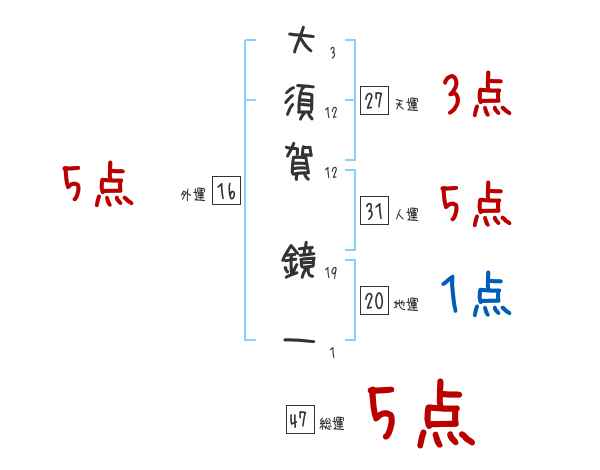 外運![]() | 大須賀鏡一さんの外運は16画の5つ星!人望が厚く大きく発展する。逆転成功が見える。 生活面を象徴する運勢です。外部から受ける影響力を表し、結婚運、家庭運や職場、環境への順応性を表します。 |